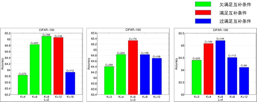 我们使用一个没有下采样结构的 8 层的网络,该网络除了第一个卷积层和最后一个全连接层外,其中有 6 层中间层,并探究这个网络在满足互补条件、欠满足互补条件、以及过满足互补条件这三种情况下的性能如何。当分解的层数固定时,每个分支的通道数越大,则该网络也欠满足状态过渡道满足互补条件状态呢,最后过渡到过满足互补条件的状态(图 2 中的直方条从左到右的过渡过程)。从图 2 的结果可以看出,当满足互补条件时,网络性能接近最优。所以互补条件是一个指导网络结构设计的指标。