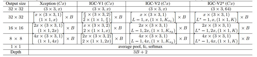 变化网络的宽度:我们采用 20 层网络,表 1 显示了网络的结构,即 Xception()、IGC-V1(