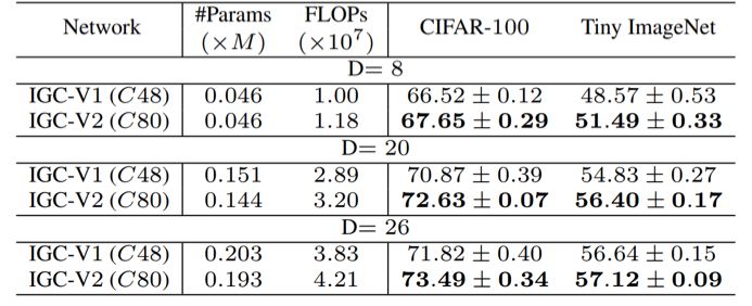 表 4:IGC-V1 和我们的网络 IGC-V2 在变化深度时的分类准确率的对比。