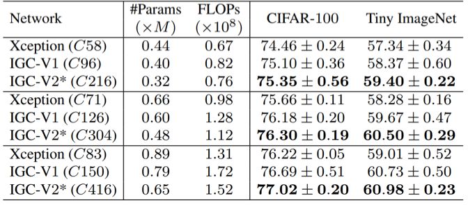 通过大量实验表明,IGC-V2 比 IGC-V1 和 Xception 在 CIFAR 和 Tiny ImageNet 上的性能更优。