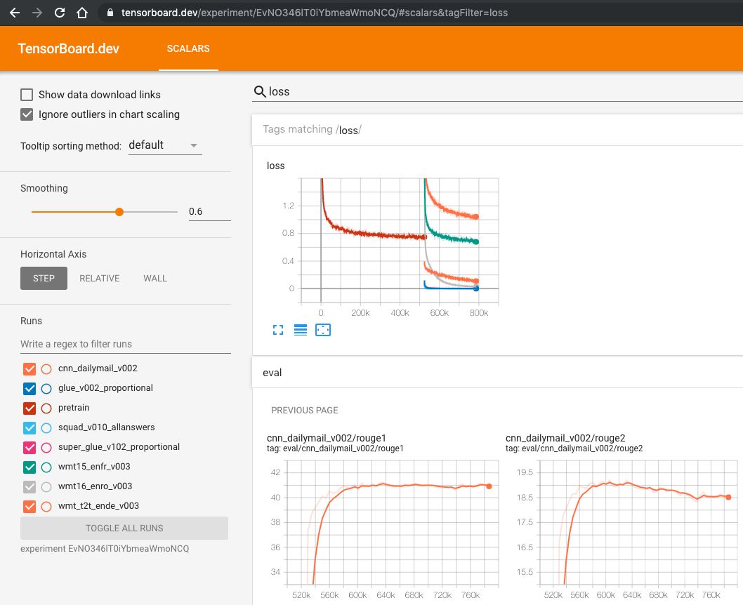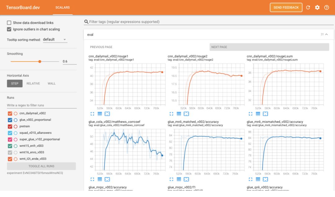 这款新工具除了可以在线直接查看结果外,Google的开发人员也希望通过TensorBoard.dev更多的功能,例如在“使用统一的文本到文本Transfer探索迁移学习的限制”一文探讨了使用文本到文本模型和一些任务的最新结果的NLP迁移学习。下面这个TensorBoard.dev示例显示了“预训练数据集”的基线训练结果: