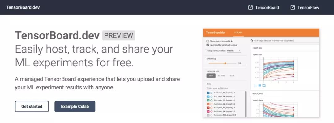 TensorBoard.dev是一项托管服务,可以为用户轻松地进行免费的托管、跟踪和共享机器学习实验。你需要做的,只是上传你的TensorBoard日志,之后会获得一个分享链接。