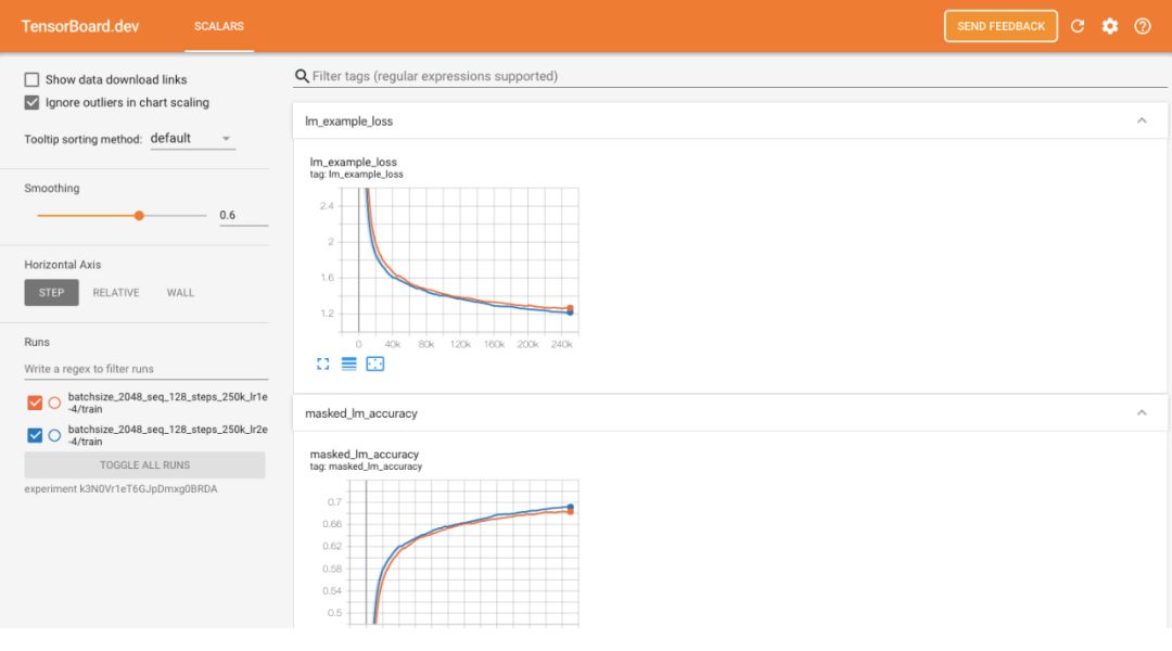按照说明使用你的Google帐户进行身份验证之后,将在TensorBoard.dev中提供链接。你甚至可以在上传过程中立即查看TensorBoard。上传程序将继续运行并上传出现在日志目录中的新日志,直到你停止该过程为止。