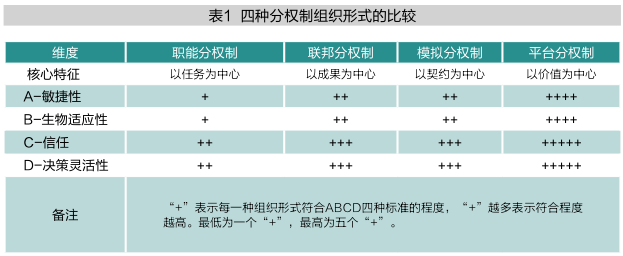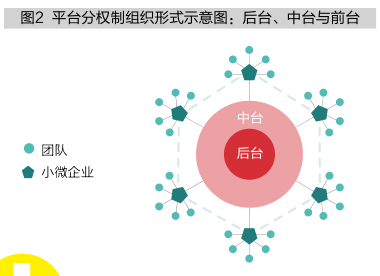 图2展示了平台分权制结构的示意图,组织被高度扁平化为“后台+中台+小微企业(前台)”三级结构。