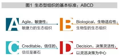 图1展示了生态型组织的四个共同标准,笔者将其称之为ABCD标准,即敏捷性、生物适应性、信任与决策灵活性。