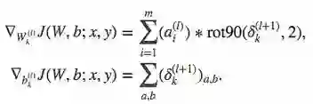 式中 k 是卷积核(filter)的下标, 是激活函数的导数,这里为了方便并没用写是对激活函数的参数进行求导,实际上对参数求导的话会再多一项激活函数输入向量 x ,从而得到维度一样的向量,并可以进行按位乘操作。upsample 操作是池化操作的反向过程,如果是 mean pooling ,就把误差项均匀传递到所有的池化层输入节点上;如果是 max pooling ,就把误差项直接传递给产生 max 值的这个输入节点上。