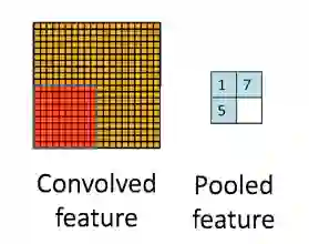 回到之前提到的图像不同区域之间的统计特性一致性,那么理论上对一个图像的不同区域再做一次相同的统计汇总,得到的特性应该仍然是一致的。比如对不同区域分块后求平均,或者求最大值。通过这种对不同区域进行统计汇总,可以显著降低特征数据的维度,因此也可以改善过拟合问题。这个过程叫做“池化”,或者 “mean pooling” , “max pooling” 。下图是一个池化过程的示意图: