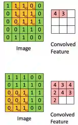 下面的图片是一个例子,对于一个 5*5 的图像使用一个 3*3 的小窗口进行卷积。需要注意的是:黄色区域内的参数是通过训练过程中学出来的,不是手工编的。然后如果一共开发了比如 N 组这样的小窗口( N 组特征提取器,大小各异),通过卷积操作后,会得到 N 组的卷积特征结果集。