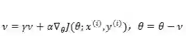 SGD 训练过程中另外一个需要注意的问题是如果目标函数在最优解附近有抖动,而且具有局部很陡的峰值,那么常规 SGD 会在局部峰值的位置震荡。很不幸 DNN 就具有这样的特点。一个解决办法是在梯度更新的时候增加动量: