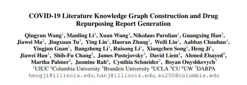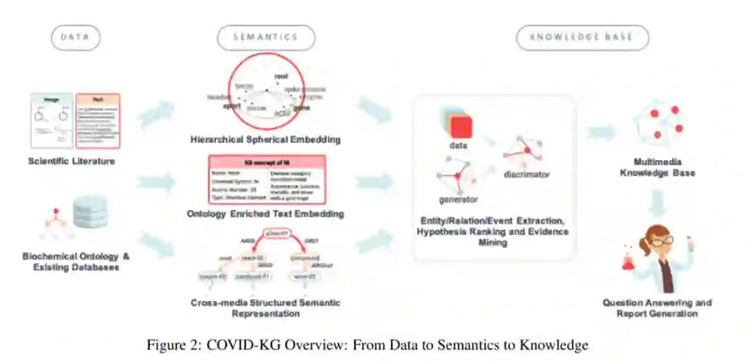 为了对抗COVID-19,临床医生和科学家都需要查阅大量相关的文献生物医学知识,了解其发病机制和相关的生物学功能。我们开发了全新的、全面的知识发现框架COVID-KG,它利用新的语义表示和外部本体来表示输入文献数据中的文本和图像,然后进行各种提取组件来提取细粒度的多媒体知识元素(实体、关系和事件)。然后,我们利用构建的多媒体信息库进行问题回答和报告生成,并以药物再利用作为案例研究。我们的框架还提供了详细的上下文句子、子图和知识子图作为证据。所有数据、KGs、资源和共享服务都是公开可用的。
