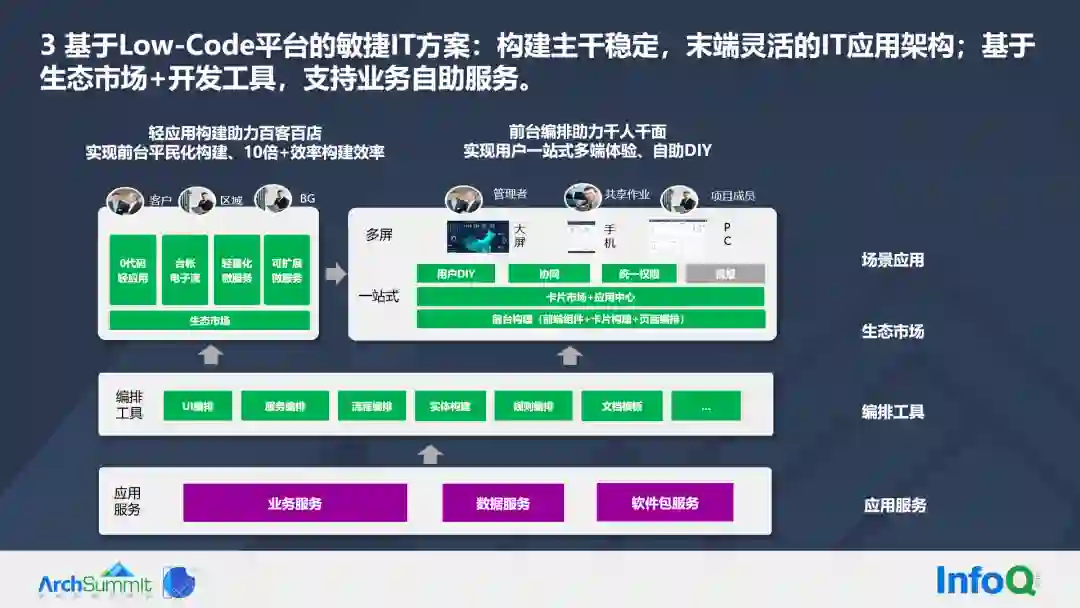 基于整体的这些挑战,华为设计了基于低代码平台的敏捷 IT 方案,整体方案分为四层,包括应用服务、编排工具、生态市场、以及面向不同用户的场景应用。最底层是应用服务,它涵盖业务服务、数据服务以及软件包服务。第二层是面向前端的编排工具,这一层使得集团 IT 人员只需要关注于主干的开发,与此同时,一些区域的 IT 人员还可以自行构建差异化的应用。