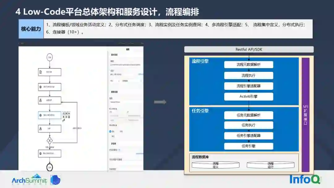 在具备基本的数据访问能力之后,仅仅依靠 CRUD 无法解决业务逻辑和规则问题,还需要一些逻辑的编写以及 API 的组合,这就是服务编排功能。有大量可用的 API 资源、技术组件以及常用连接是服务编排的核心,通过不断地沉淀业务相关的组件(SPI)/ 业务服务,可以较好地在快速响应不同的需求。