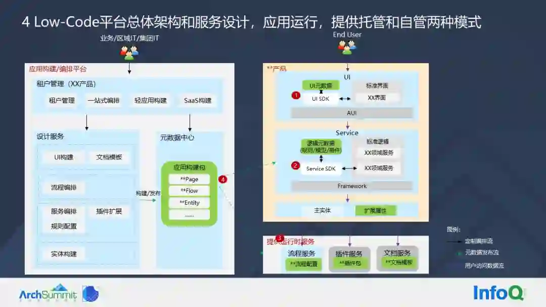 低代码的运行有两种模式——托管运行与自管模式。低代码平台可以提供 SDK 模式,将流程服务换和 UI 插件化,让低代码编排的元数据和主干应用运行在同一个容器中。