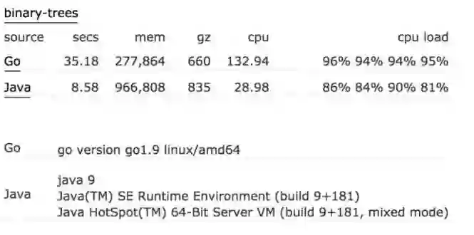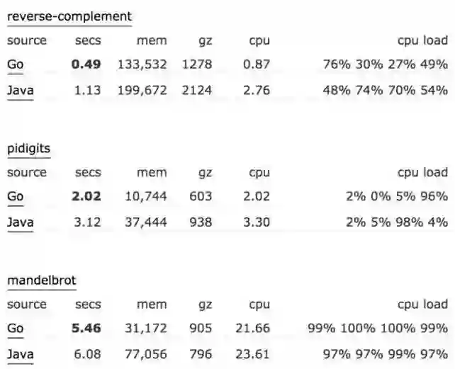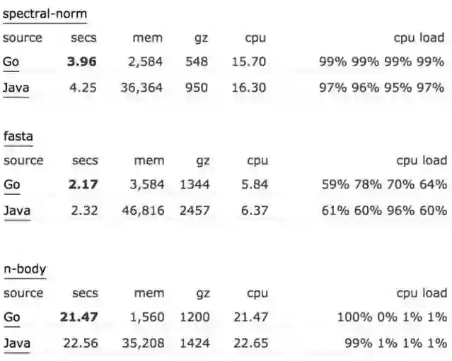 Go 极其地快,其性能与 Java 或 C++ 相似。在我们的使用中,Go 一般比 Python 要快 30 倍。以下是 Go 与 Java 之间的基准比较: