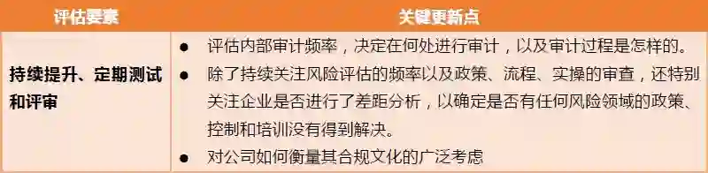 新指引增加了针对风险的合规资源分配的重要性。特别告诫不要将太多的资源投入到对特定公司来说是低风险的问题上。对于那些以风险为基础的,将注意力和资源投入到高风险交易中的有效的合规方案,检察官将给以加分项,即使它未能防止在低风险领域发生的违规行为。