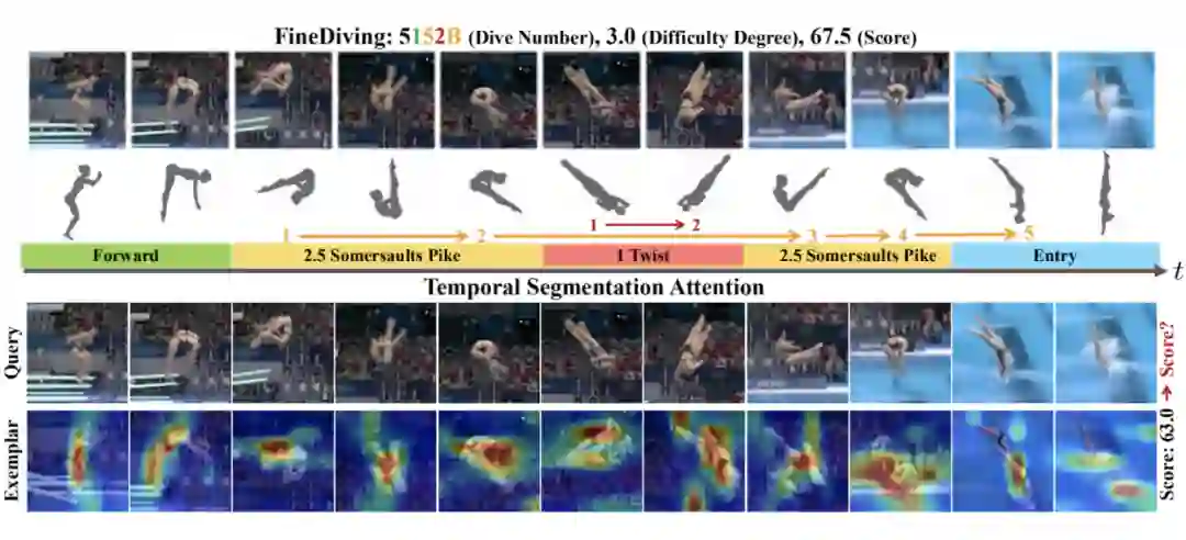 3)来自国际泳联的官方跳水得分(dive score)、裁判分数、难度系数。如图(1)所示。基于 FineDiving,我们进一步提出一种基于过程感知(procedure-aware)的 AQA 方法来评估动作质量。所提出的框架通过构建新的时间分割注意模块(Temporal Segmentation Attention,TSA)学习过程感知嵌入,以实现具有更好可解释性的可靠评分。