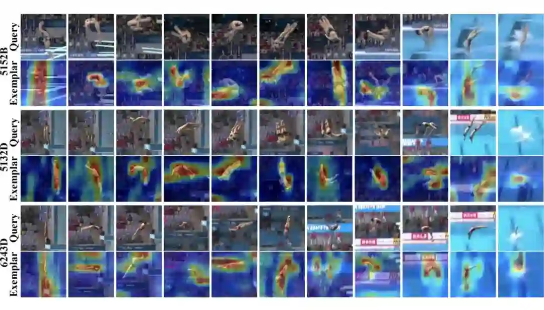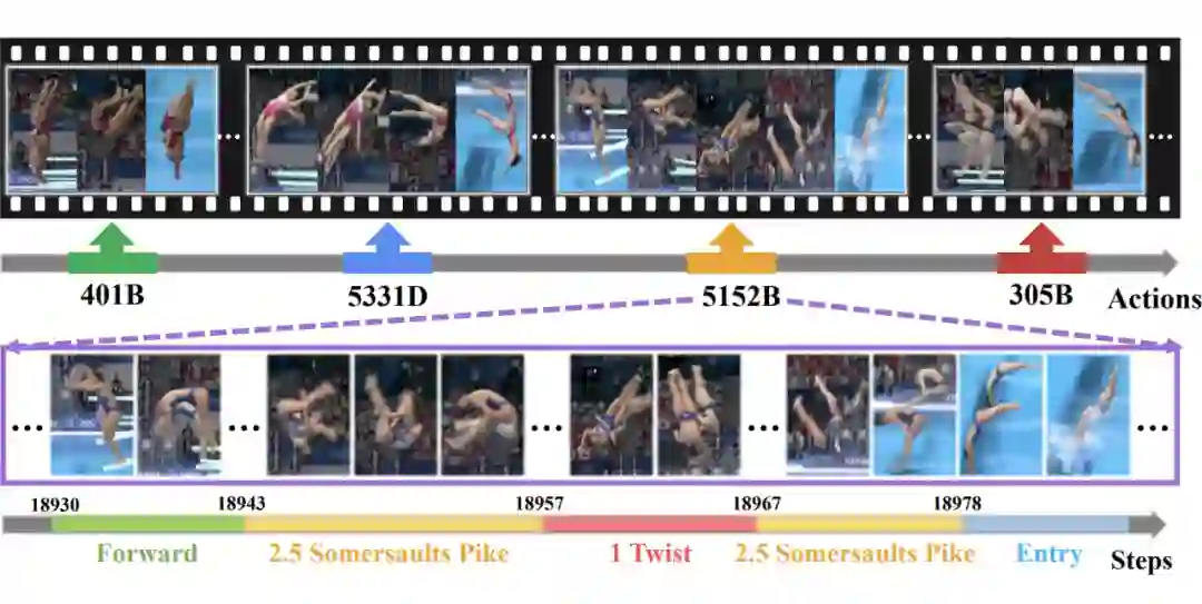 例如,跳水比赛通常都是在水上运动中心拍摄的,并且视频中所有运动员都执行相同的动作程式:起跳、空中动作、入水。这些动作程式的细微差别主要体现在执行空中动作时,运动员翻腾转体的周数、空中姿势以及入水情况(e.g., 水花大小)。