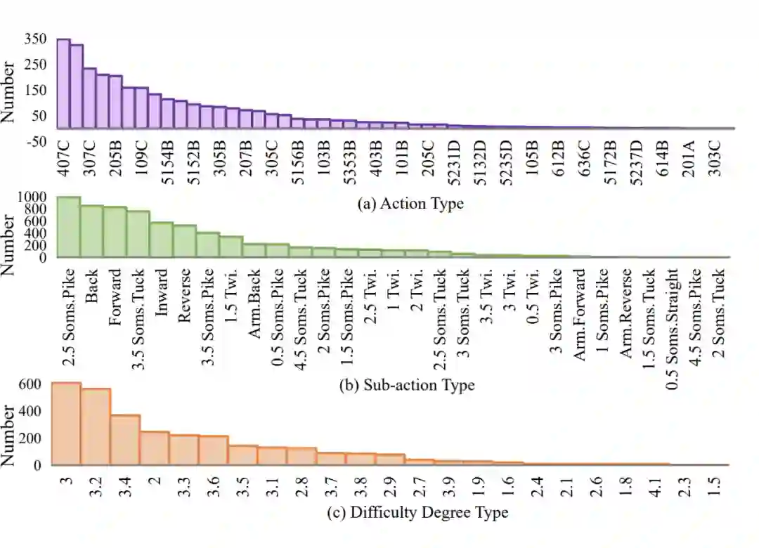 FineDiving 数据集包含 3000 个样本,涵盖 52 种 action types、29 种 sub-action types 以及 23 种难度难度系数,如图(4)所示。