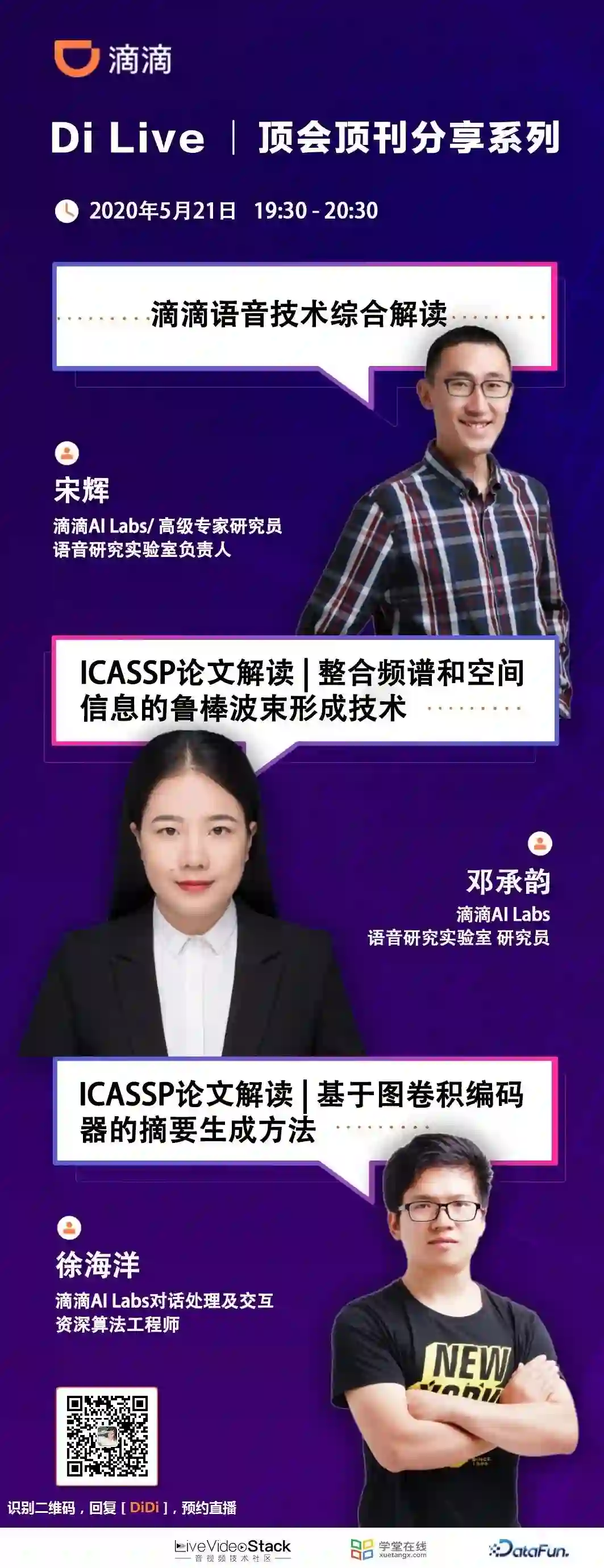 5月21日(周四)晚19点30,我们邀请到滴滴语音团队三位技术专家为大家带来滴滴语音技术概览与 ICASSP 2020 论文解读。
