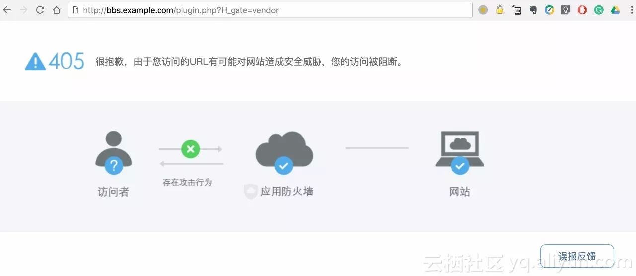 完成WAF配置后,访问触发漏洞的URL:http://bbs.example.com/plugin.php?H_gate=vendor ,浏览器直接提示访问请求已经被阿里云WAF拦截,bingo!