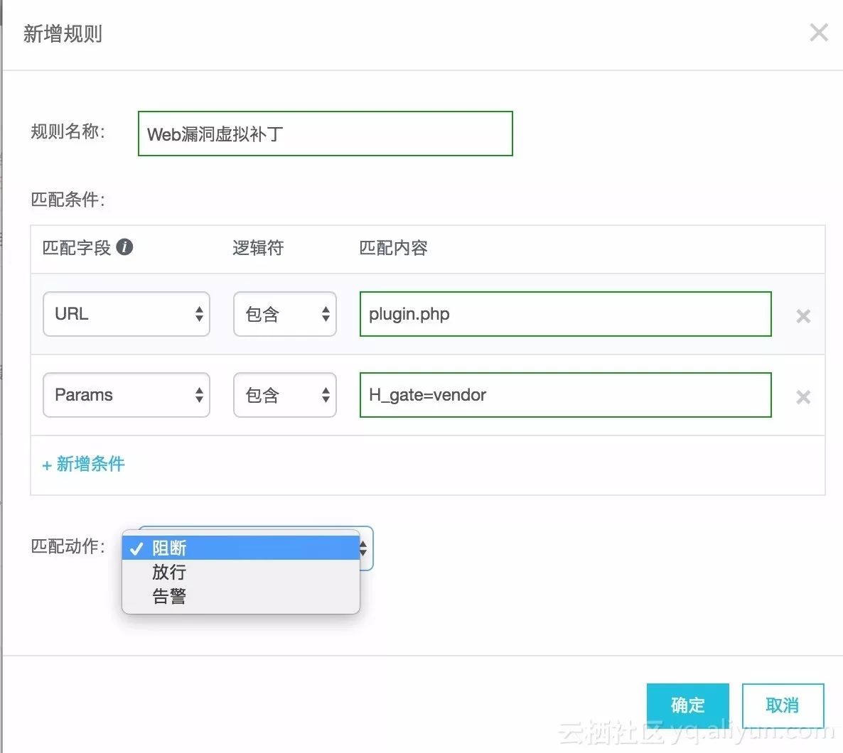 进入配置界面,直接点击【新增规则】,在弹出的对话框中进行URL匹配及拦截配置。针对本次漏洞利用的关键URL:http://bbs.example.com/plugin.php?H_gate=vendor, 为降低拦截的误判率,设置规则如下: