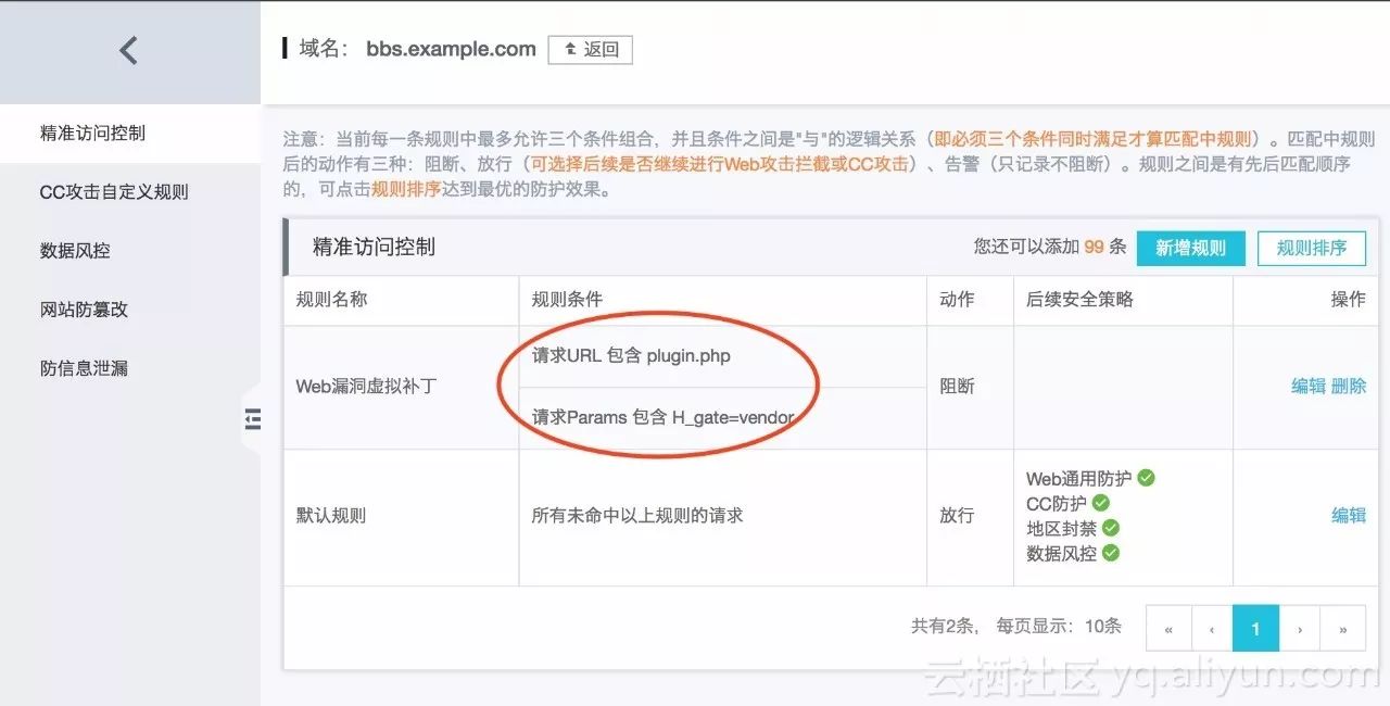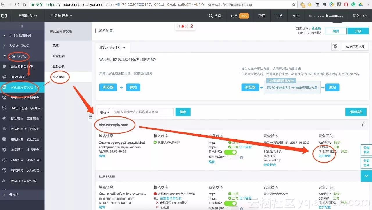 登录阿里云控制台,通过导航菜单【安全(云盾)】|【Web应用防火墙(网络安全)】|【域名配置】找到当前服务器的域名bbs.example.com。
