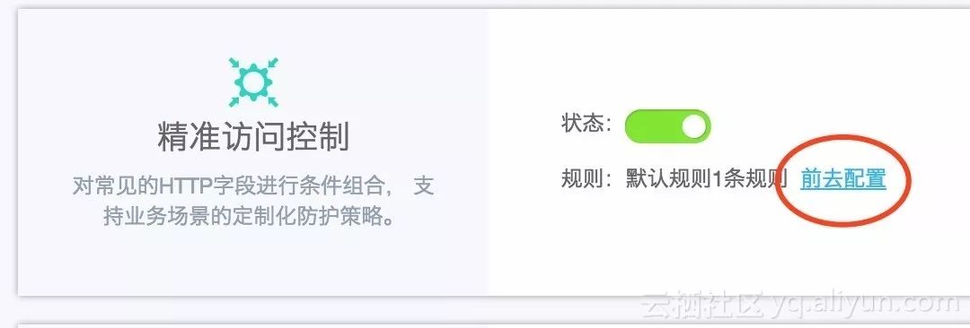 本次虚拟补丁配置需要用到【精准访问控制】,所以该功能务必处于开启状态。在该功能已经开启的前提下,点击超链接【前去配置】。