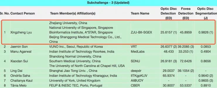 浙江大学、新加坡国立大学、新加坡生物信息学研究所联合北京上工医信公司组成的团队在视神经盘与中央凹检测比赛上得分领先。