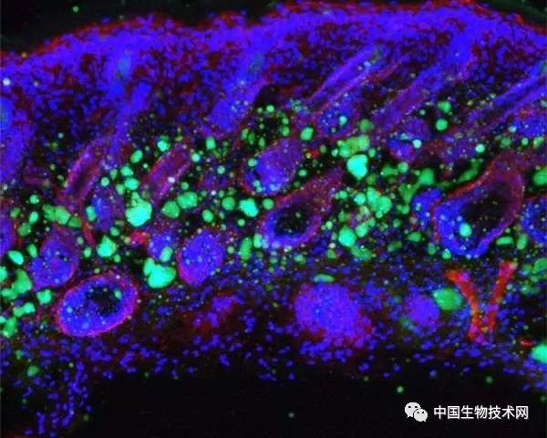上图中,皮肤细胞(蓝色)和脂肪细胞(绿色)。脂肪细胞层形成机体的最后一道屏障。图片来源: UC San Diego Health