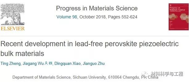 近日,材料科学与工程学院吴家刚教授团队在国际材料科学领域顶尖综述期刊《Progress in Materials Science》(IF=23.75,5年期影响因子为33.19) 发表了题为“Recent Development in Lead-free Perovskite Piezoelectric Bulk Materials”的90页长篇综述论文,四川大学作为唯一署名单位。这是该团队在该期刊发表的第二篇文章,也是四川大学作为第一单位在该期刊上发表的第三篇文章。论文第一作者为博士研究生郑婷(我校博士研究生作为第一作者首次在该期刊发表),通讯作者为吴家刚教授。