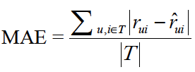 针对评分预测模型,可以评估的准确度指标主要有:RMSE(均方根误差)、MAE(平均绝对误差)。他们的计算公式分别是: