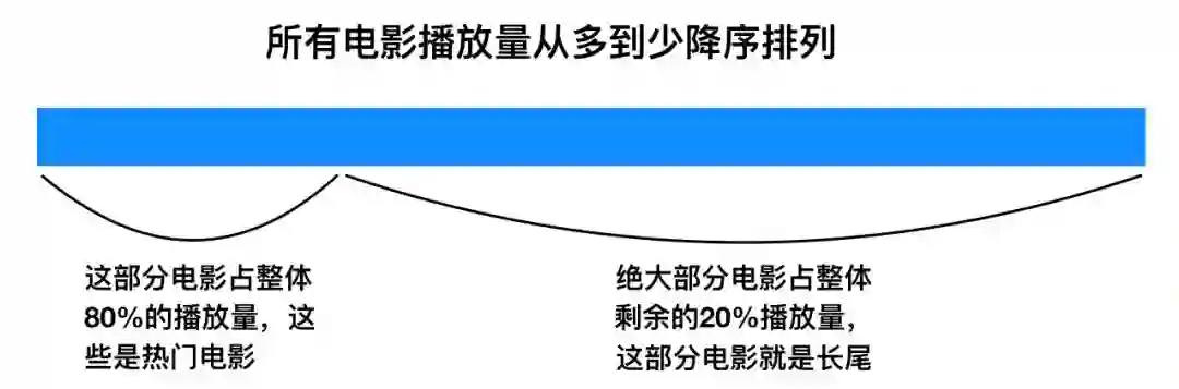 最后,通过日志分析,我们可以知道哪些“标的物”是流行的,哪些是长尾。拿视频推荐来举例,我们可以根据二八定律,将电影播放量降序排列,播放量占总播放量80%的前面的电影,算作热门电影,后面的当做长尾(参考下面图5)。