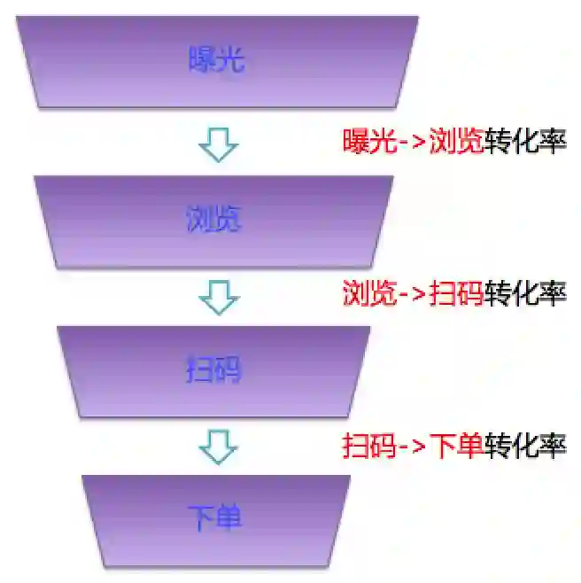 推荐模型上线提供推荐服务后,最重要的用户行为指标有转化率、购买率、点击率、人均停留时长、人均阅读次数等,一般用户的行为是一个漏斗(例如,推荐曝光给用户->用点击浏览->用户扫码->用户下单,参考下面的图4),我们需要知道从漏斗一层到下一层的转化率。漏斗模型可以非常直观形象的描述用户从前一个阶段到下一个阶段的转化,非常适合商业上定位问题,通过优化产品流程,提升用户在各个阶段的转化。
