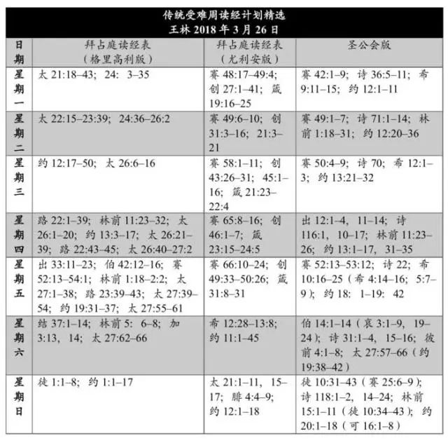 《圣公会读经表》则既有福音书对耶稣行程的记载,也有《以赛亚书》的神学观点,同时还引用《诗篇》的灵修,以及新约书信中对“圣受难周”的反思,也相当有特色。