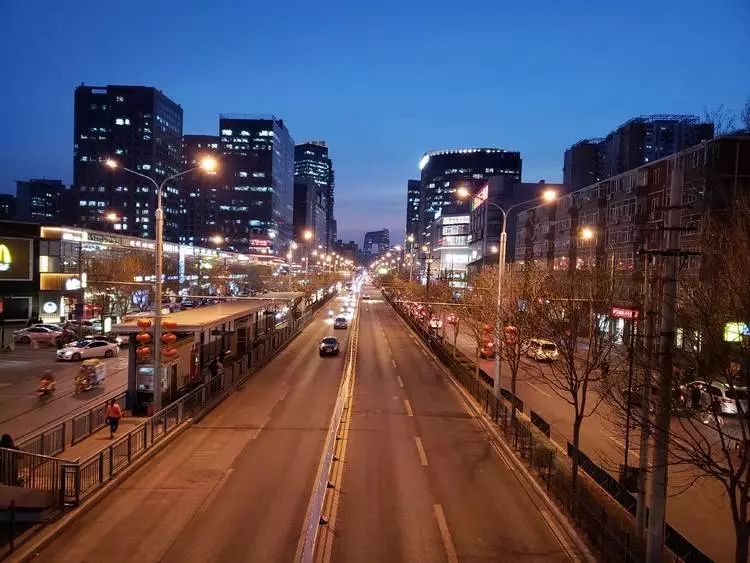 这两张照片拍摄于晚上 9 点左右的北京,肉眼看到的实际亮度比样张中还要低一个等级,树后面的楼房细节因为光线太暗,用肉眼其实是看不清的。这说明目前的旗舰手机拍夜景的亮度都很高了,最大的差距在于画面的纯净度。