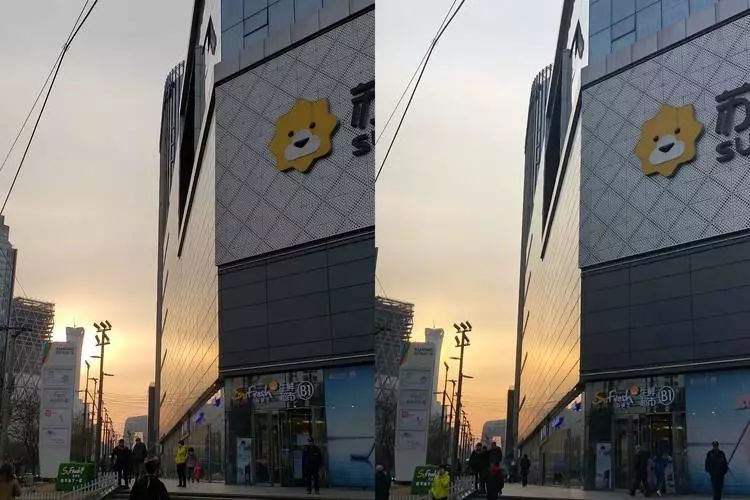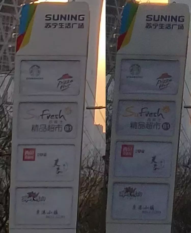 从实际的拍照体验来看,白天光线充足的环境中,S9+ 和 iPhone X 差距并不大,属于手机拍照中“神仙打架”的级别。比如这张在下午五点同一个角度拍摄的照片,无论是苏宁生活广场广告牌,还是逆光场景中的大楼,观感都很接近。