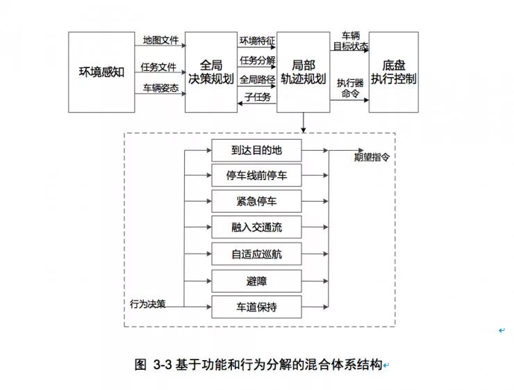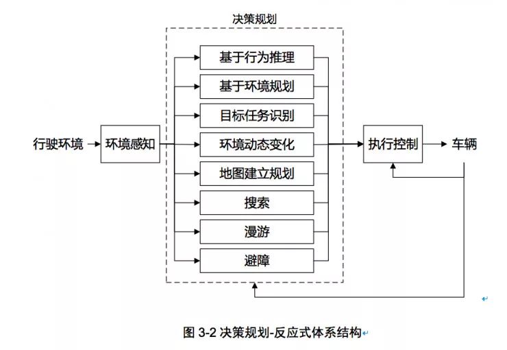 决策规划技术结构体系包括分层递阶式体系结构、反应式体系结构、混合式体系结构。以下的三张图为三种体系结构的图解。