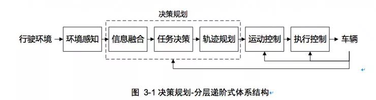 智能驾驶决策规划系统的开发和集成基于递阶系统的层次性特征,可分为四个关键环节,分别是信息融合、任务决策、轨迹规划和异常处理。