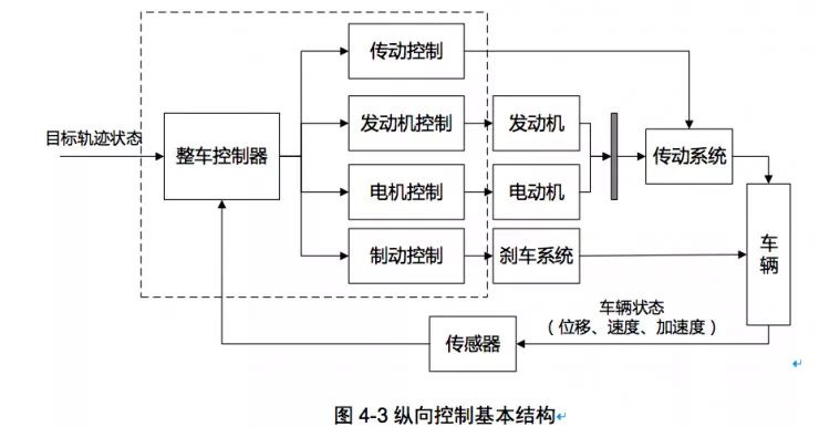车辆纵向控制是在行车速度方向上的控制,即车速以及本车与前后车或障碍物距离的自动控制。巡航控制和紧急制动控制都是典型的自动驾驶纵向控制案例。这类控制问题可归结为对电机驱动、发动机、传动和制动系统的控制。各种电机-发动机-传动模型、汽车运行模型和刹车过程模型与不同的控制器算法结合,构成了各种各样的纵向控制模式,典型结构如图所示。此外,针对轮胎作用力的滑移率控制是纵向稳定控制中的关键部分。
