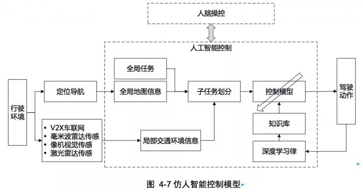基于人工智能决策控制模型本质上是模拟人脑对外界环境信息和车体本身信息的感知(图 4-7),同时由驾驶经验并同在线学习机制来获得持续稳定输出的过程。