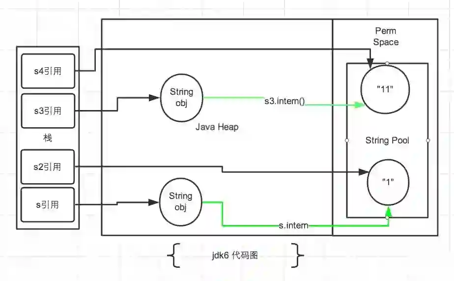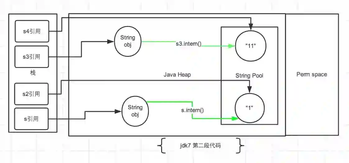 然后,s3.intern();,将s3中的字符串”11”放入了常量池中,因为此时常量池中不存在字符串”11”,因此常规做法与跟jdk6相同,在常量池中生成一个String对象”11”——然而,jdk7中常量池不在Perm区中了,相应做了调整:常量池中不需要再存储一份对象了,而是直接存储堆中的引用,也就是s3的引用地址。