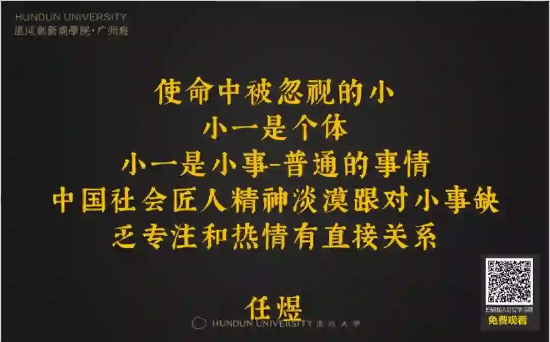 普通的事情做不好,其实讲实话是没什么使命感可言。为什么?因为中国社会咱们社会发展这个阶段,最近老提匠人精神,其实你们都知道提什么就缺什么,对吧?所以中国社会匠人精神淡漠,跟对小事缺乏专注和热情有直接关系。我其实认为说在这种整个社会环境下,想诞生一个真正有使命的组织是很困难的,因为你没有基础。