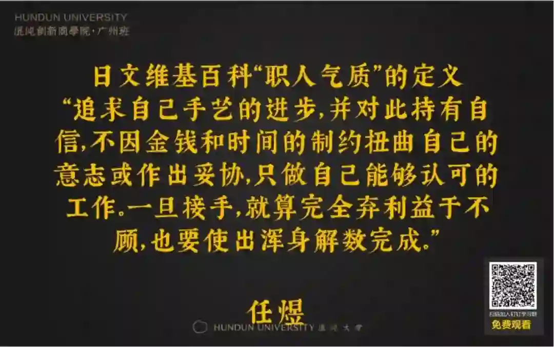 所以李善友教授那天讲寿司之神小野二郎,其实在个人使命上最重要的是什么?就是职人精神,职人气质。日本维基百科对职人气质的定义是什么?追求自己手艺的进步,并对此持有自信,不因金钱和时间的制约,扭曲自己的意志或做出妥协,只做自己能够认可的工作。一旦接受,就算完全弃利于不顾,也要使出浑身解数出来。