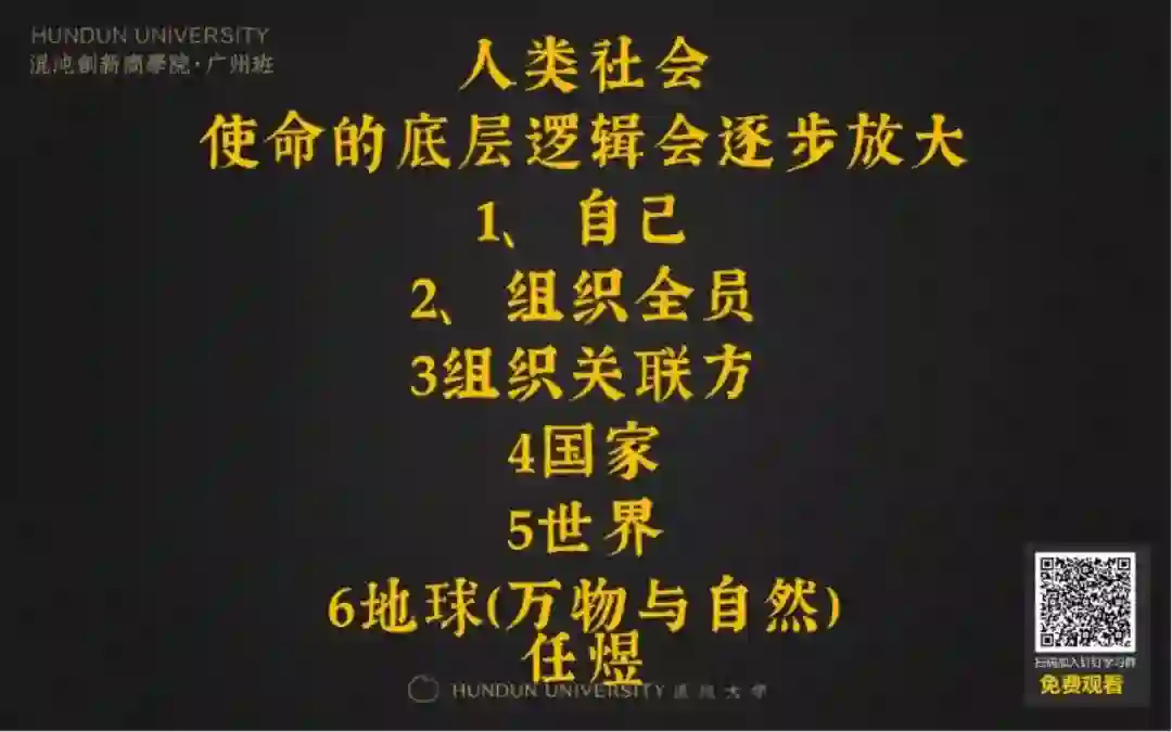 随着人类社会发展,如果你的觉悟不断提升的话,使命的底层逻辑是可以逐步放大的,就是从自己到组织的全员到组织的利益相关方,再到你的国家,再到整个世界,再到地球,万物为自然,你自然会把自己的范围扩展出去。
