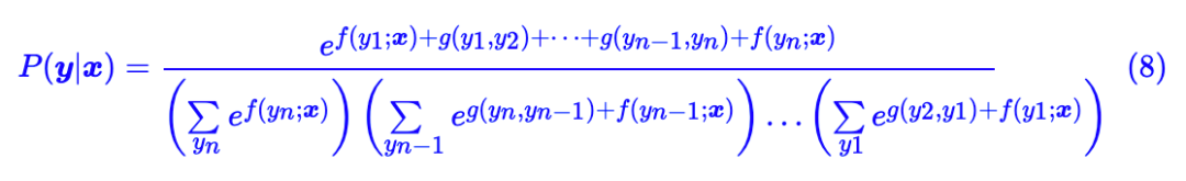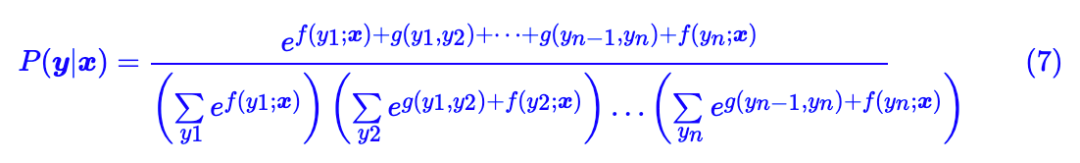 这个打分函数的特点就是显式地考虑了相邻标签的关联,其实 g(yk−1,yk) 被称为转移矩阵。现在得分算出来了,概率就是得分的 softmax,所以最终概率分布的形式设为: