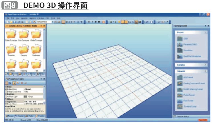 根据英国 Emulate3D 公司官网及百度百科介绍,Demo3D是由英国 Emulate3D 公司开发的高逼真度物流系统动画、仿真、控制平台,主攻物流系统的数字化敏捷设计、震撼展示、方案验证,Demo3D创新地支持PLC 外部设备和SoftPLC数据直接控制虚拟模型,操作极为简便,极大缩短物流设备试车时间,降低调试费用和风险。Demo3D操作界面,如图8。