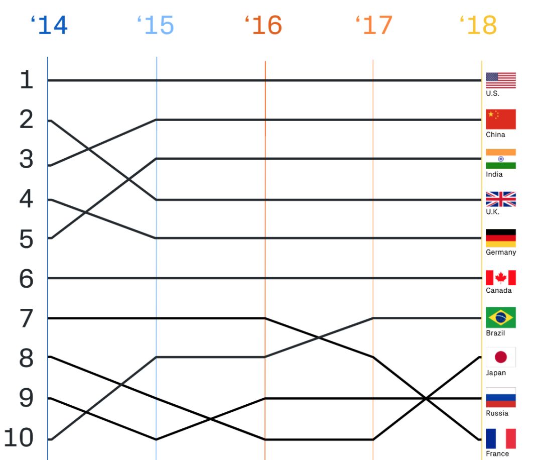 美国、中国和印度是 contributors 数量最多的三个国家,中国今年占据第二位,提升了一个名次。今年有 800 万新开发者加入 GitHub,并且新增注册数量最多的也依次是美国、中国和印度。2018 年的新增用户数远远超过了前六年的总和。新的 contributors 是 2017 年的 1.6 倍。