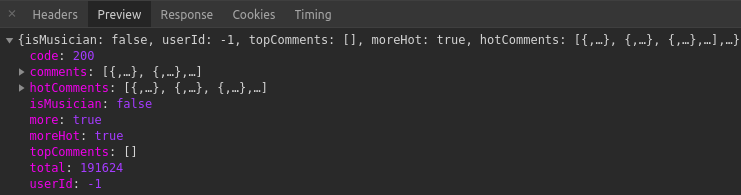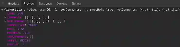 发现我们所需要的数据就在这json格式的数据中,其中comments中是第一页的全部评论,一共20条,hotcomments是精彩评论一共有15条,每首歌曲只有第一页评论才有精彩评论.接着看一下它的请求头,点击Headers