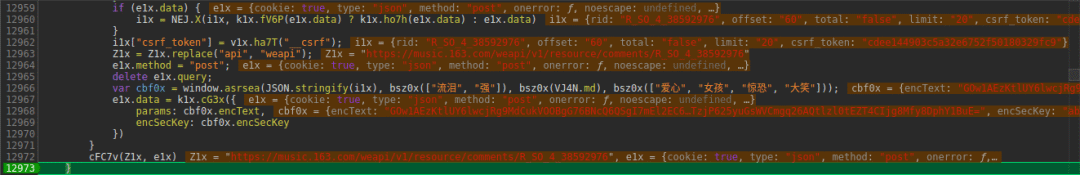 通过断点调试发现params和encSecKey是由js脚本中的window.asrsea()函数生成的.