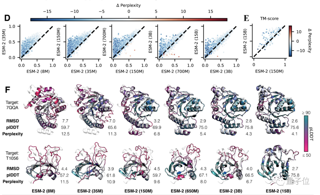 通过这个150亿参数的ESM2,ESMFold只用一个序列作为输入,就能有效预测端到端的3D结构;而AlphaFold2则需要多序列输入才能有良好表现。